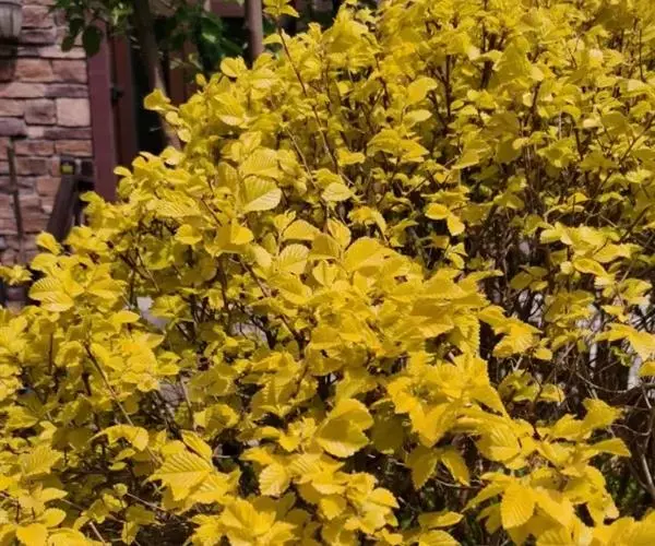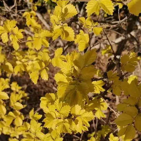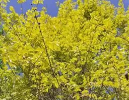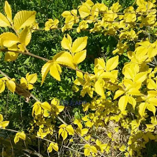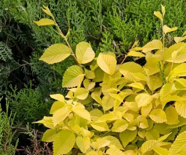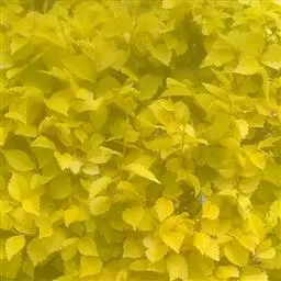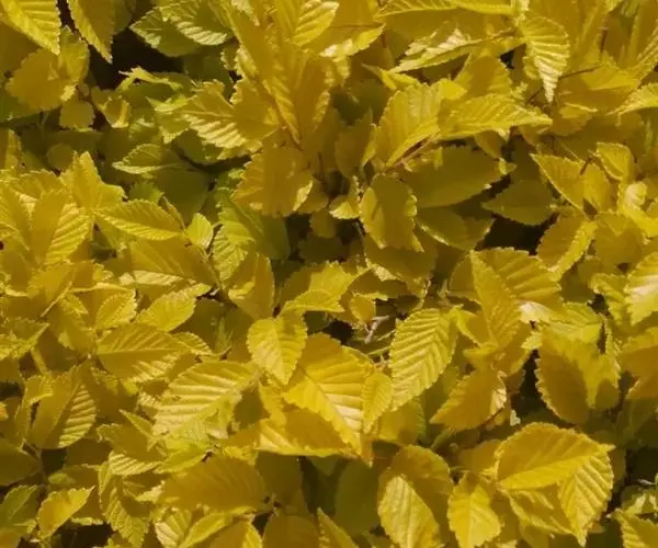 中华金叶榆,榆科榆属,系白榆变种。叶片金黄色,有自然光泽,色泽艳丽;叶脉清晰,质感好;叶卵圆形,平均长3-5cm,宽2-3cm, 比普通白榆叶片稍短;叶缘具锯齿,叶尖渐尖,互生于枝条上。金叶榆的枝条萌生力很强,一般当枝条上长出大约十几个叶片时,腋芽便萌发长出新枝,因此金叶榆的枝条比普通白榆更密集,树冠更丰满,造型更丰富。