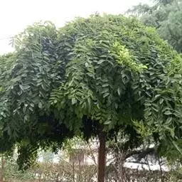 中华金叶榆属密枝型白榆,具有造型容易、种类丰富的特点。由于其枝条萌生量大,生长速度快,一般1年生苗即可进行修剪造型。常见的有高球型、低球型、乔木双层造型、乔木多层造型、柱型、动物型等。各类造型均以白榆为砧木进行嫁接而成。高球型一般在砧木离地面1m处嫁接,接后第二年春季进行修剪成球;低球型在砧木离地面5m处进行嫁接,接后第二年春季进行修剪成球;乔木双层、多层造型是在主干高度2m以上的砧木上进行,分别在地面1m处或2m处、 处进行嫁接,生长1年后进行修剪,可修成方型、球型、三角型等多种造型;柱型中华金叶榆可用底部嫁接苗经4~5年时间培养,或在主干通直的砧木上密集嫁接,反复修剪而成;动物型是最为费工的一种,需要结合盘扎、嫁接、修剪多道工艺而成,也是市场价值最高的一种。各类造型均具有造型丰满、颜色金黄的特点,观赏性优于普通绿色品种。