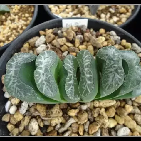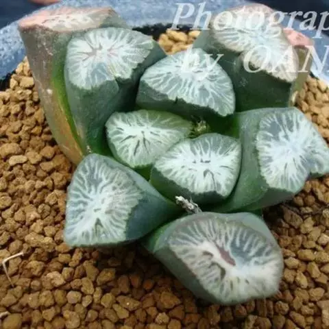 万象(学名:Haworthia truncata var. maughanii (Poelln.) Halda)是百合科十二卷属多年生肉质植物,植株无茎,有粗壮的肉质根,肉质叶排列成松散的莲座状,叶从基部斜出,半圆筒形,顶端截形,多为圆形,也有近似三角形或其他不规则形状。截面透明或半透明。。花序长20厘米左右,小花8-10朵,白色,有绿色中脉。