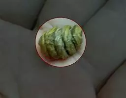 瓜形似佛手,又似皇冠,形状怪异又名“小丑南瓜”,浅黄白色,瓜长11厘米左右,高8厘米,重约130克。
