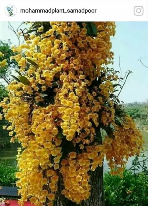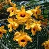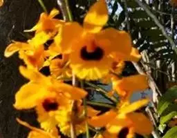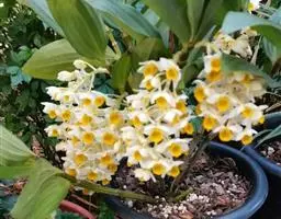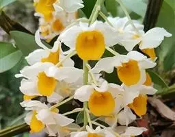 聚石斛,,顶生叶1枚,矩圆形,先端钝或微凹,边缘多少波状;6月开花,总状花序生于新茎上部节上,有花5~12朵,橙黄色,唇瓣近圆形,质地薄,形如金币,非常美丽。