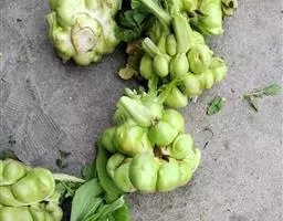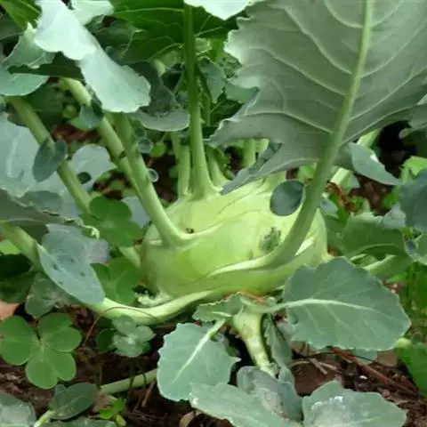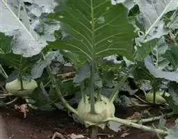 根系浅,茎短缩,叶丛着生短缩茎上。叶片椭圆、倒卵圆或近三角形,绿、深绿或紫色,叶面有蜡粉。叶柄细长,生长一定叶丛后,短缩茎膨大,形成肉质茎,圆或扁圆形,肉质、皮色绿或绿白色,少数品种紫色。球茎甘蓝一定大小的幼苗在0-10℃通过春化,后在长日照和适温下抽薹、开花、结果。花器官结构及开花授粉习性与结球甘蓝同。球茎甘蓝按球茎皮色分绿、绿白、紫色三个类型。按生长期长短可分为早熟、中熟和晚熟三个类型。早熟品种植株矮小,叶片少而小,定植后50-60天收获,代表品种有北京早白、天津小缨子等。中、晚熟品种植株生长势强,叶片多而大,定植到收获需80-100天。代表品种有笨苤蓝、大同松根、云南长擘蓝等。