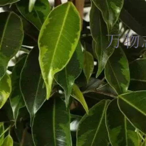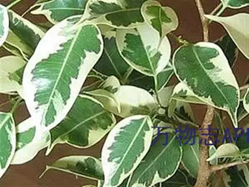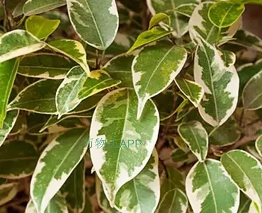 花叶垂榕为常绿灌木,株高l米至2米,分枝较多,有下垂的枝条,叶互生,阔椭圆形,革质光亮,全缘,淡绿色,叶脉及叶缘具不规则的黄色斑块。叶柄长,托叶披针形。全株具乳汁。