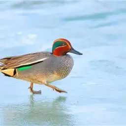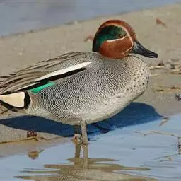 绿翅鸭是小型鸭类,体长37厘米,体重约0.5千克。嘴脚均为黑色。雄鸟头至颈部深栗色,…