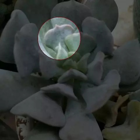 叶片长圆型,环状对生,叶片先端微尖,叶色在强光与昼夜 温差大或冬季低温期叶色会变的非常漂亮的蓝白,叶尖常年轻微红褐色,弱光则叶色浅蓝,叶片变的窄且长,枝条也容易徒长。