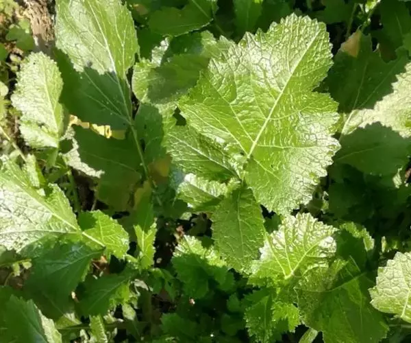 榨菜(通称) 菱角菜、羊角儿菜(四川)下部叶的叶柄基部肉质,膨大,形成高低不平的拳状;基生叶倒卵形或长圆形,长40-80厘米,平坦或皱缩,基部大头羽状深裂,成为具沟的粗叶柄。