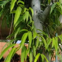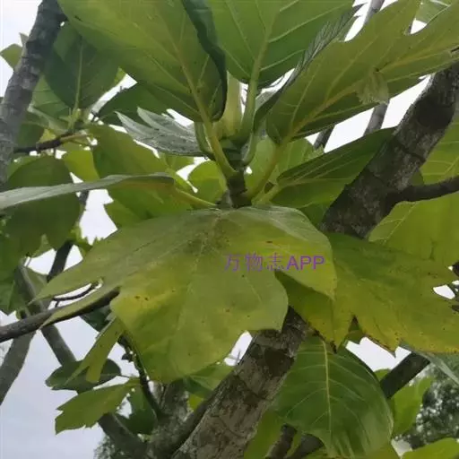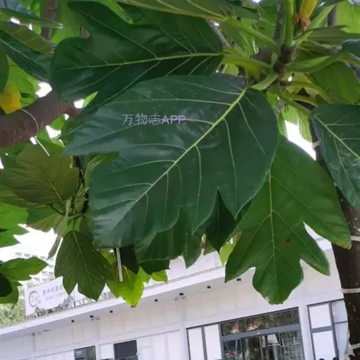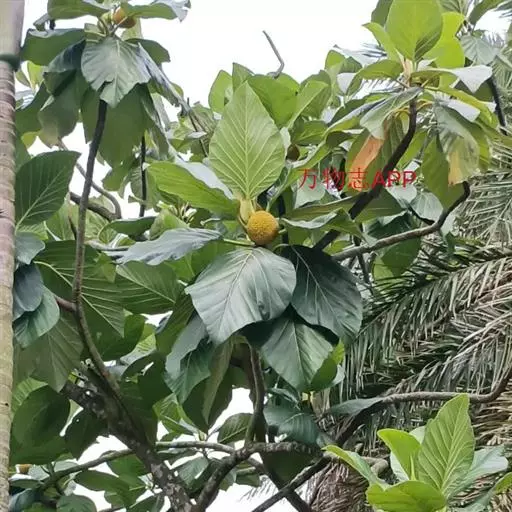 面包树(学名:Artocarpus incisa (Thunb.) L.)桑科常绿乔木,高10-15米;树皮灰褐色,粗厚。叶大,互生,厚革质,卵形至卵状椭圆形,两面无毛,表面深绿色,有光泽,背面浅绿色,全缘;叶柄长8-12厘米;托叶大,披针形或宽披针形,黄绿色,被灰色或褐色平贴柔毛。花序单生叶腋,雄花序长圆筒形至长椭圆形或棒状,黄色;雄花花被管状,被毛,上部2裂,裂片披针形,花药椭圆形,花柱长,聚花果倒卵圆形或近球形,绿色至黄色,表面具圆形瘤状凸起,成熟褐色至黑色,柔软,内面为乳白色肉质花被组成;核果椭圆形至圆锥形。栽培的很少核果或无核果。