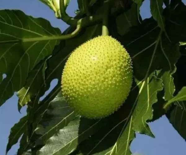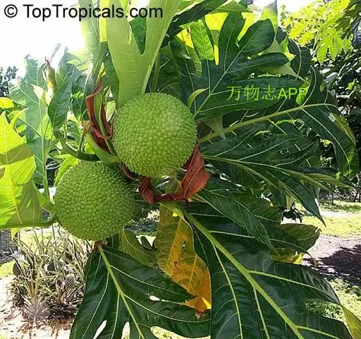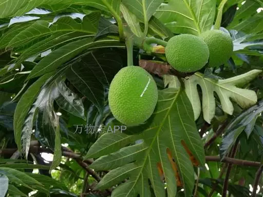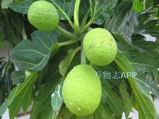 面包树是一种木本粮食植物,果实富含淀粉,烧烤后可食用。烤制过的面包果,味如面包,松软可口,酸中有甜,常被用作口粮。可以烤食。