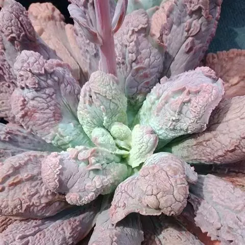 狂野男爵是中大型园艺变种,植株看起来是真的恶心,且怎么养都会长高的品种。狂野男爵植株的茎部较粗壮,随着生长而逐渐伸长长高。叶片莲座型密集排列,株径可达20厘米以上。叶片长圆形,叶片有点波浪状,植株的叶面大面积凸起不规则疣凸,叶色为浅绿至紫红,新叶色浅、老叶色深。强光与昼夜温差大或冬季低温期叶色绿至紫红,叶尖和叶缘轻微发红,老叶和叶片的疣凸会紫红,弱光则叶色浅绿,叶片变的窄且长,也会非常薄。狂野男爵叶面上覆有微白粉,老叶白粉掉落後呈光滑状,生长中的狂野男爵老叶片容易轻微下翻。