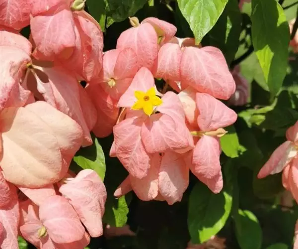 聚伞花序顶生;苞片和小苞片脱落;花萼管长圆形或陀螺形,萼裂片5枚,脱落或宿存,其中有些花的萼裂片中有1枚极发达呈花瓣状,很少全部均成花瓣状,白色或其他颜色,且有长柄,通常称花叶;花冠黄色、红色或稀为白色,高脚碟状,花冠管通常较长,外面有绢毛或长毛,里面喉部密生黄色棒形毛,花冠裂片5枚,在芽内摄合状排列;雄蕊5枚,着生于花冠管的膨胀部位,内藏,花丝很短或无,花药线形;子房2室,花柱丝状,2型,内藏或伸出,柱头2个,细小;胚珠极多数,着生于通常长圆状的肉质胎座上。
