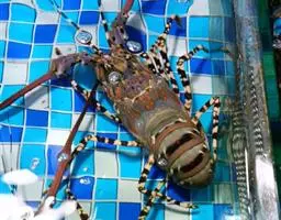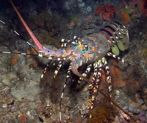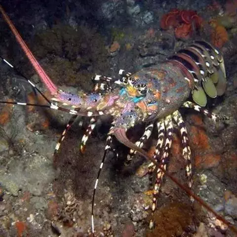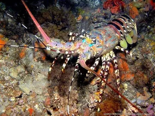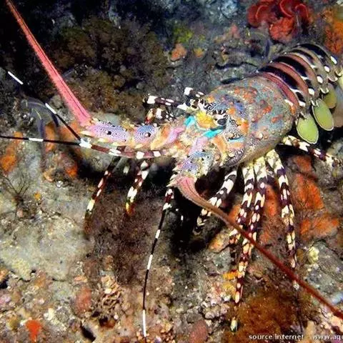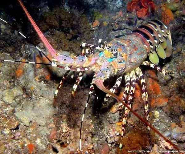 锦绣龙虾(Panulirus ornatus)为无螯下目,龙虾科,龙虾属的一种,俗称青龙虾、花龙虾、山虾、大和虾、沙虾等。体长可达60厘米,是龙虾属中体型最大者。腹部、第一触角和步足有黑褐色和黄色相间的斑纹。触角的基部有四对疣刺,后面的一对较小。体色多彩明亮。