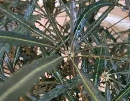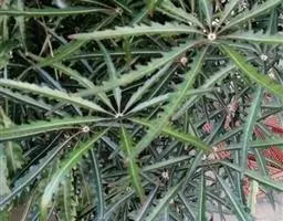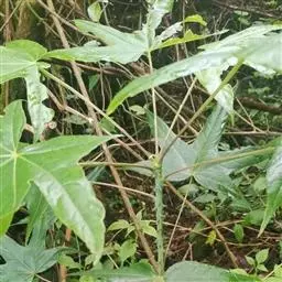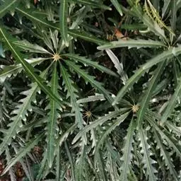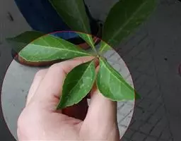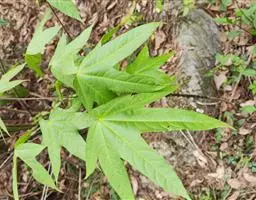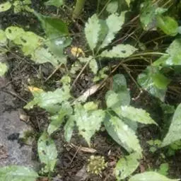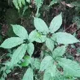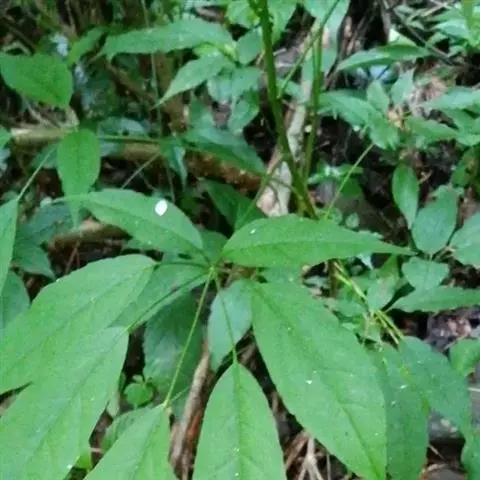 指状复叶3-6个轮生茎顶;托叶多数,簇生,线形,长不足2毫米;叶柄长5-11.5厘米,具条纹,光滑无毛;小叶柄中央的长1.2-3.5厘米,两侧的长0.2-1.2厘米,无毛;叶片膜质 ,中央的最大,长椭圆形至倒卵状长椭圆形,长7-13厘米,宽2-5厘米,先端渐尖至长渐尖,基部阔楔形至圆形,两侧叶片最小,椭圆形至圆状长卵形,长3.5-7厘米,宽1.3-3厘米,先端渐尖至长渐尖,基部偏斜,边缘具重细锯齿,齿尖具短尖头,齿间有1刚毛,两面沿脉疏被刚毛,主脉与侧脉在两面凸起,网脉不显。