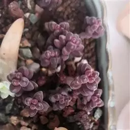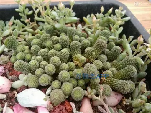 壁生魔南景天科魔南景天属多肉植物,壁生魔南植株叶面上布满半透明状的疣凸,就像裹了层白砂糖。小小的叶片莲花状组成约1厘米直径的叶冠。温差大的时候,叶片呈现迷人的紫色。初夏开花,单花品种,花朵较小,授粉不易。