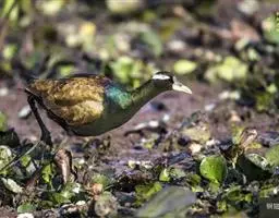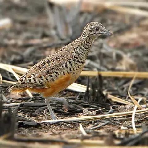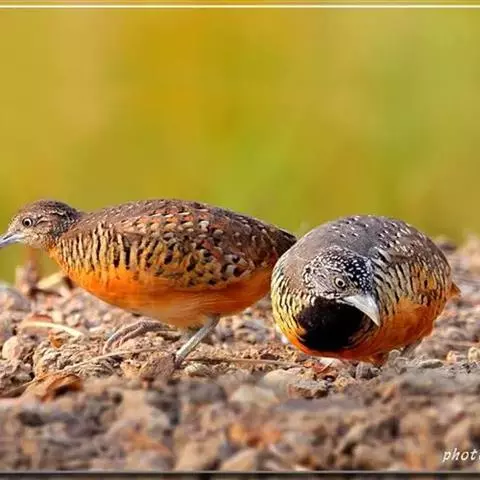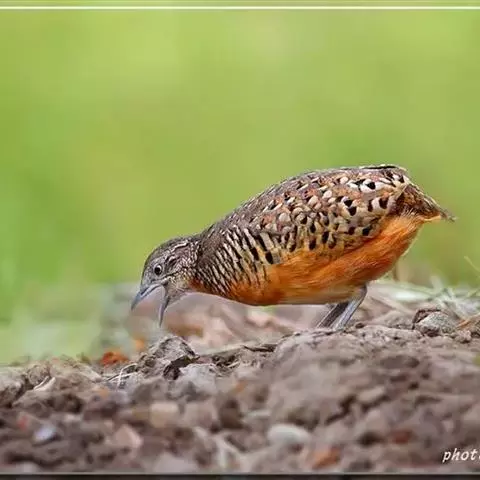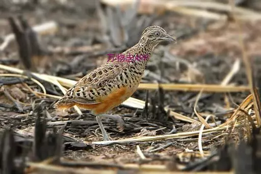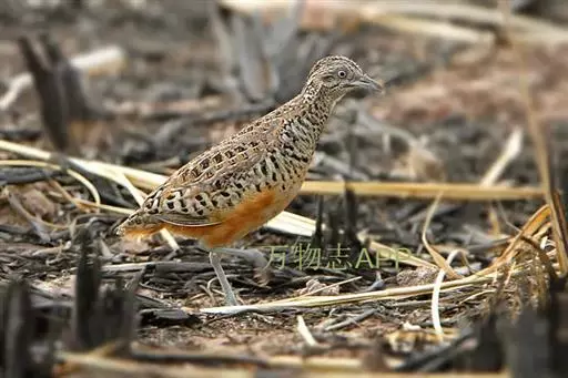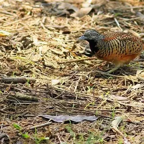 棕三趾鹑(学名:Turnix suscitator):属鹤形目三趾鹑科,体重54-70克;体长143-173毫米。体形和羽色与林三趾鹑和黄脚三趾鹑相似,雄鸟头上黑色,杂有褐色羽毛及白色斑点,背至尾羽褐色杂有灰褐色羽毛,喉、颈侧乳白色,杂有黑色细斑,上胸、胸侧淡黄褐色有黑色横斑。雌鸟红褐色较浓,脸、喉、前颈黑色有乳黄色斑点,胸侧橙褐色有黑色横斑。虹膜沙白色或灰黄色;嘴蓝灰色或灰褐色,尖端色淡;跗蹠和趾灰绿色,爪淡黄色。