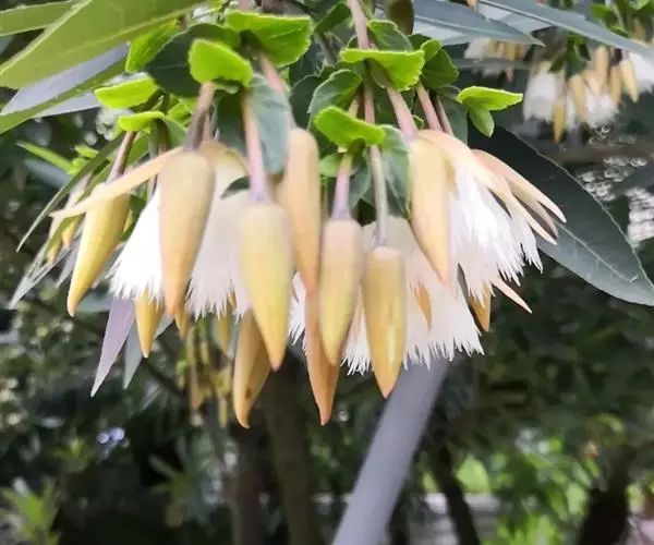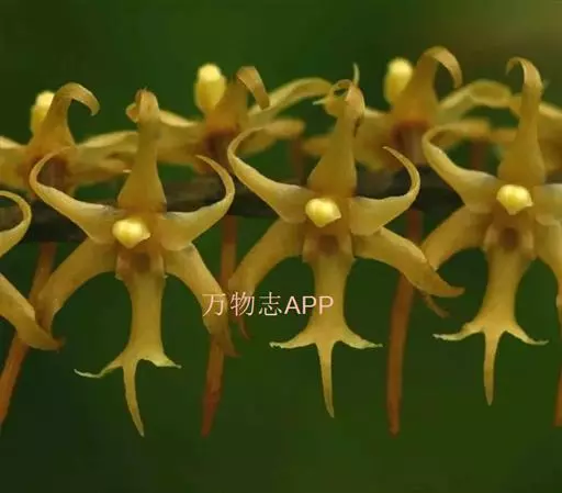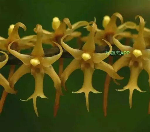 直立或附生蔓性灌木,除花冠喉内部外,全株无毛。叶坚纸质,椭圆状长圆形,长8-16厘米,宽2-4.5厘米;侧脉不明显。伞形状聚伞花序腋外生或顶生,向下弯,着花10-15朵;花萼内面基部有5-6个腺体;花冠黄白色,5深裂,开放后强度反折,花冠喉韵为具长硬毛;副花冠5裂,裂片披针形,着生于合蕊冠背部,其基部延生角状长距,成星状射出;花粉块长圆形,直立。蓇葖单生,线状披针形,长12-16厘米,直径1厘米,无毛;种子卵形,长4毫米,宽2毫米,顶端具白色绢质种毛;种毛长4厘米。花期5-7月,果期10-12月。