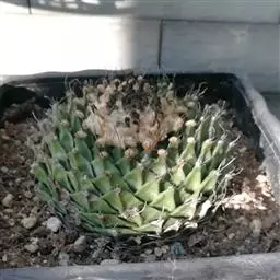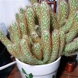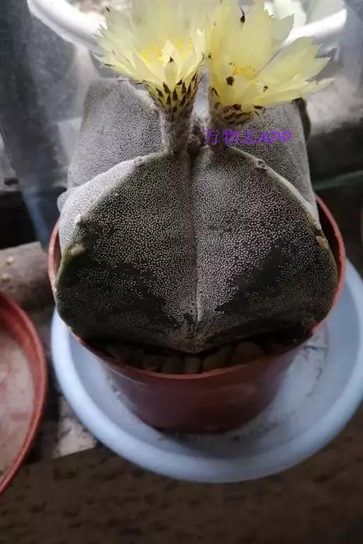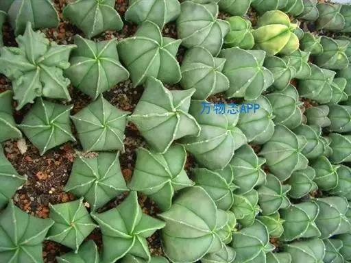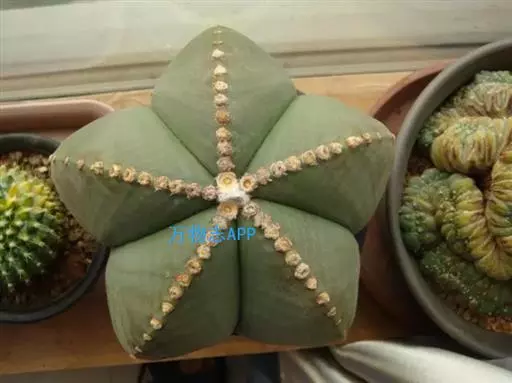 鸾凤玉 植株球形,老株变为细长筒状。球体直径10~20厘米,有3~9条明显的棱,多数为5棱。棱上的刺座无刺,但有褐色绵毛。球体灰白色密被白色星状毛或小鳞片。花朵着生在球体顶部的刺座上,漏斗形,黄色或有红心。三棱的“三角鸾凤玉”较稀有名贵,四棱的“四角鸾凤玉”也称四方玉,四条阔棱均匀对称,也很有趣。
