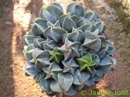 植株单生,初始圆球形,后长成圆柱状,直径16-18厘米。高达50-60厘米,具5个脊较高的棱,球体呈对称五星状,大型球可增至6-8棱。灰青绿色的球体上密被细小的白色星点。春季至夏季顶生漏斗状橙黄色花,花径4-5厘米。