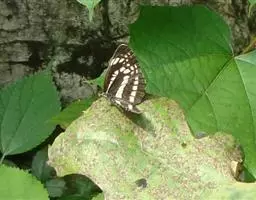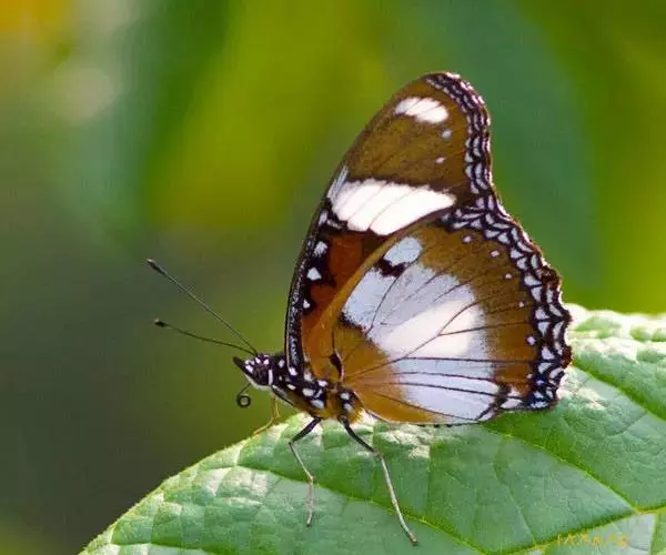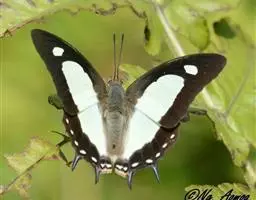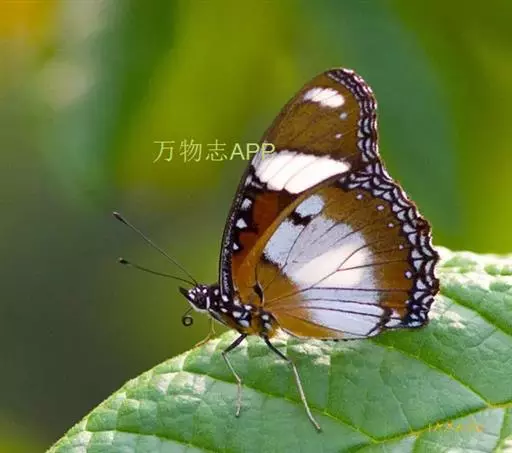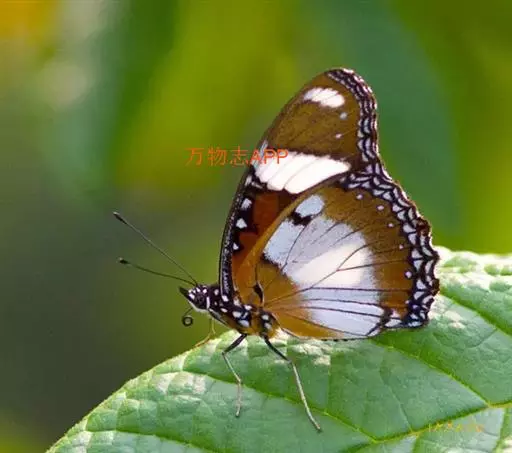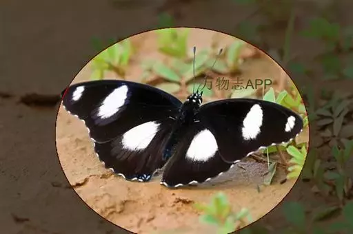 它的雌蝶以幕拟金斑蝶而闻名,雄蝶翅黑褐色,前翅中室外有1个长椭圆形白斑,顶角附近有1个小形白斑;后翅中域有1个大形白斑;前后翅的白都斑有紫色光泽。雌蝶翅橙黄色,顶角有1个较小的白斑,中室外侧有1列宽的白色斜带;后翅外缘黑褐色,前缘有1个黑斑。两翅外缘均有两列成对的小白点。