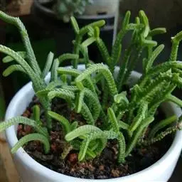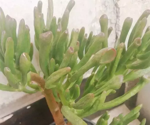 植株呈多分枝的灌木状,茎明显,圆形,表皮黄褐色或灰褐色。 叶互生,在茎或分枝顶端密集成簇生长,肉质叶筒状,长4厘米至5厘米,粗0.6厘米至0.8厘米,顶端呈斜的截形,截面通常为椭圆形,叶色鲜绿,顶端有些许微黄,有蜡状光泽,冬季其截面的边缘呈红色,叶形奇特,色彩宜人,是理想的室内小型观叶植物。