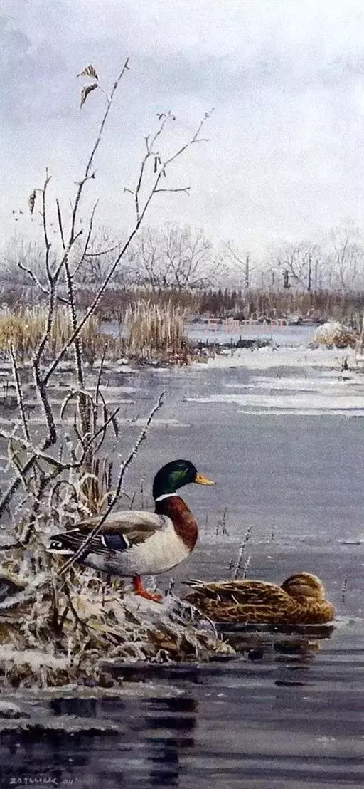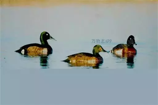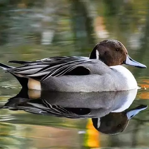 绿头鸭 绿头鸭雄鸟头、颈绿色,具辉亮的金属光泽。颈基有一白色领环。上背和两肩褐色,密杂以灰白色波状细斑,羽缘棕黄色;下背黑褐色,腰和尾上覆羽绒黑色,微具绿色光泽。中央两对尾羽黑色,向上卷曲成钩状,外侧尾羽灰褐色,具白色羽缘,最外侧尾羽大都灰白色。两翅灰褐色,翼镜呈金属紫蓝色,其前后缘各有一条绒黑色窄纹和白色宽边。颏近黑色,上胸浓栗色,具浅棕色羽缘;下胸和两胁灰白色,杂以细密的暗褐色波状纹。腹部淡色,亦密布暗褐色波状细斑。尾下覆羽绒黑色。