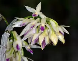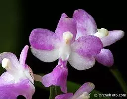 风兰 H.H.Hu):植株高8-10厘米。茎长1-4厘米,稍扁,被叶鞘所包。叶厚革质,狭长圆状镰刀形。…