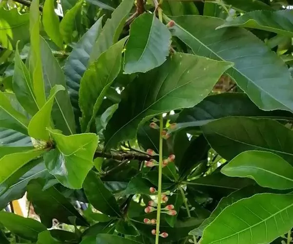 常绿小乔木或中等大乔木,稀灌木状,高可达20米;小枝稍粗壮,直径3-6毫米,干燥时灰褐色。叶常丛生枝顶,有短柄,纸质,倒卵形至倒卵状椭圆形或倒卵状矩圆形,长12-30厘米或更长,宽4-10厘米,顶端短尖至渐尖,基部钝形,常微心形,边缘有圆齿状小锯齿;侧脉10-15对,稍粗大,两面凸起,网脉清晰。