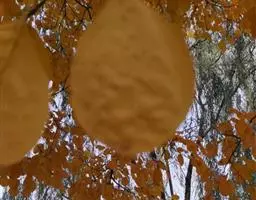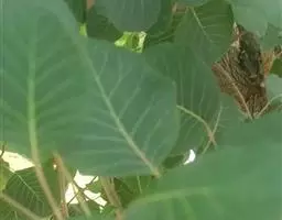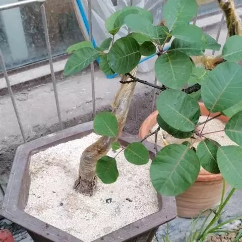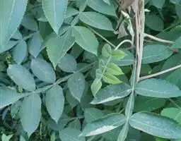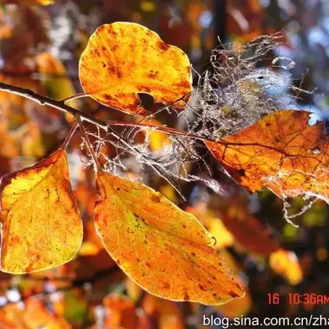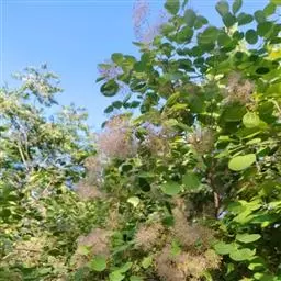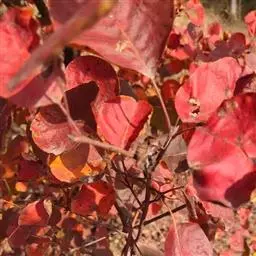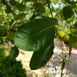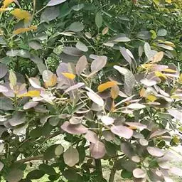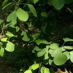 粉背黄栌叶卵圆形,较大,长3.5-10厘米,宽2.5-7.5厘米,无毛,但叶背显著被白粉;叶柄较长,1.5-3.3厘米,与欧洲产的原变种显著不同。
