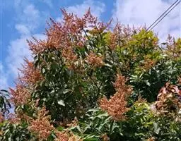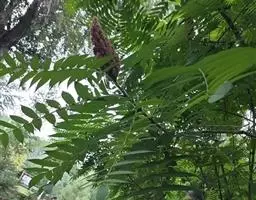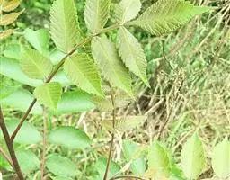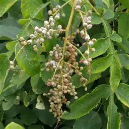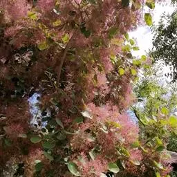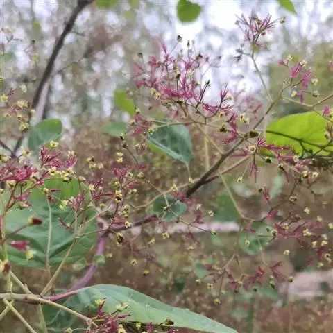 粉背黄栌 灌木,高2—7米;小枝圆柱形,棕褐色,无毛。叶互生,纸质,卵圆形,长3.5—10厘米,宽2.5—7.5厘米,先端微凹或近圆形,基部圆形或浅心形,全缘,两面无毛,叶背明显被白粉;叶柄长1.5—3.3厘米,上面平。圆锥花序顶生,无毛,长达23厘米;花杂性,黄绿色;苞片技针形,长约1.5毫米;花柄长约3毫米,纤细;花萼5裂,裂片狭三角状披针形,长约1.1毫米,宽约0.5毫米,无毛,先端短尖;花瓣5,卵形或卵状椭圆形,长约1.6毫米,宽约0.9毫米,无毛;雄蕊5,长约1.2毫米,花丝近钻形,花药卵圆形,与花丝等长;花盘大,黄色,盘状;子房近球形,偏斜,径约0.4毫米,无毛,花柱3,分离,近顶生。核果棕褐色,无毛,具皱纹,近肾形,长4-4.5毫米,宽2.5—3毫米。