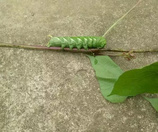 刚孵化的幼虫长6.9mm,淡绿色,在尾端具有一只大的脚,较大的幼虫长达76.2或101.6mm,亮绿色。烟草天蛾幼虫身体的两侧各有七条白色斜纹,并有一只红色的弯脚,臀背具尾角一个。蛹长约50mm,宽18mm,红褐色。头部口器明显突出,略呈钩状,喙与蛹体紧贴,末端露出。5~7腹节的气孔前方各有一气孔沟,当腹节活动时可因摩擦而微微发出声响。