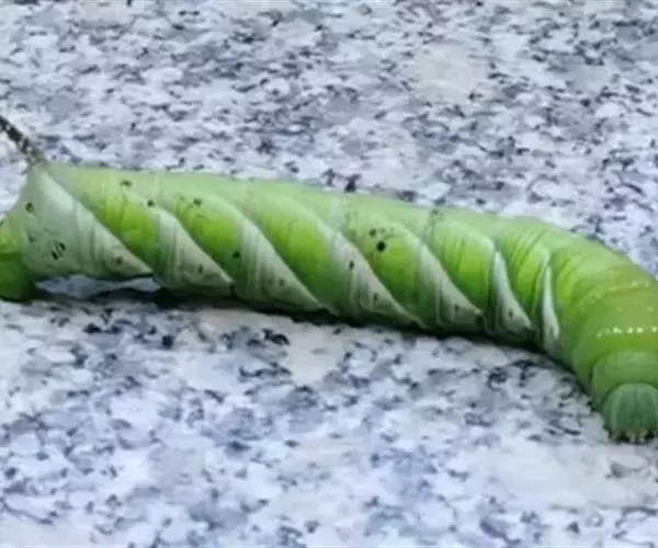 烟草天蛾,幼虫身体的每一侧均布满斜纹,这种昆虫在美国最为常见,由于喜欢吃很多种蔬菜作物的叶子和茎,它们被视为一种害虫。这只独特的天蛾幼虫被众多白色棉花状昆虫覆盖。它们是绒茧蜂,幼年时将天蛾幼虫的身体当成自己的家。白色的好似米粒一样的东西实际上是绒茧蜂的卵。