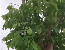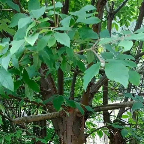 落叶乔木,高8-10米。树皮灰褐色或深褐色,深纵裂。小枝无毛,当年生枝绿色,多年生枝灰褐色,具圆形皮孔。冬芽小,卵圆形;鳞片锐尖,外侧微被短柔毛。