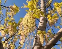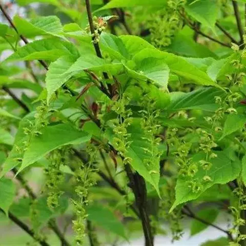 翅果嫩时淡绿色,成熟时淡黄色或淡褐色,常 成下垂的伞房果序;小坚果压扁状,长1.3-1.8厘米,宽1-1.2厘米;翅长圆形,两侧平行,宽8毫米,常与小坚果等长,稀稍长,张开成锐角或钝角。花期4月,果期8月。