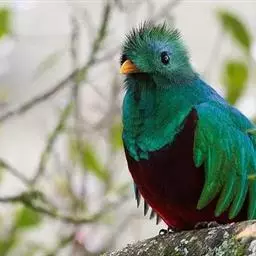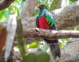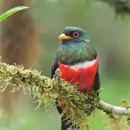 橙胸咬鹃:全长约28厘米。雄鸟头、颈橄榄绿色,上体及中央尾羽栗色;中央尾羽具黑色端,…