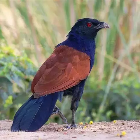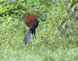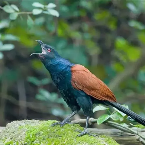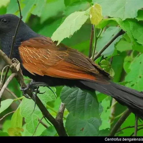 红翅凤头鹃:体长约38厘米,顶冠及凤头黑色,具显眼的直立凤头,背及尾黑色而带蓝色光泽,翅栗红色,…