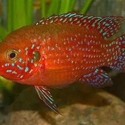 红宝石鱼是鲈行目慈鲷科伴丽鱼属 鱼类,又名红花鲈、宝石鱼。个体较大,身长12—15厘米。背鳍宽大,…