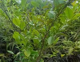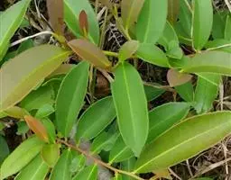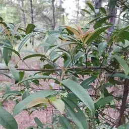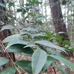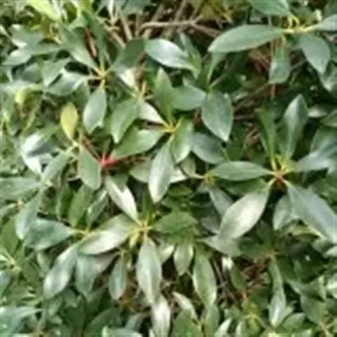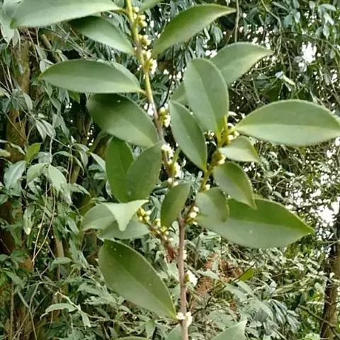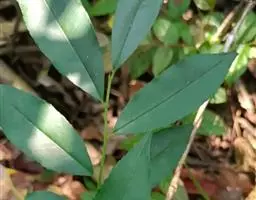 乔木,高约15米,有时为灌木状或小乔木;树皮黑褐色;小枝灰白色或灰褐色,圆柱形,无毛。叶革质,通常聚生在嫩枝近顶端,呈假轮生状,叶形变异很大,通常为椭圆形或长圆状椭圆形至狭椭圆形,有时近披针状椭圆形,偶有为阔椭圆形至卵状椭圆形,长8-13 厘米,宽3-5.5 厘米,偶有为6-7厘米,宽2-2.5厘米,顶端短渐尖,有时短尖,尖顶钝,偶有近钝形或圆钝形,基部楔形或阔楔形,边全缘或具稀疏浅钝齿,稍反卷,上面深色,有光泽,下面淡绿白色,密被红褐色腺点;中脉在上面稍凹下,下面隆起,侧脉10-12对,上面稍明显,下面不甚明显,有时稍隆起;叶柄长2-3厘米。