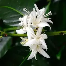 咖啡树对生的叶片呈长椭圆形,叶面光滑,末端的树枝很长,分枝少,而花是白色的,开在叶柄连结树枝的基部。