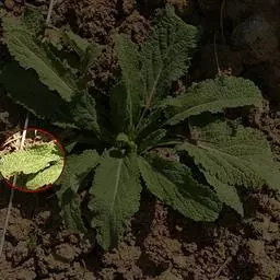 叶有基出叶和茎生叶两种,均具柄,叶片三角状或椭圆状戟形,稀心状卵圆形,有时具圆的侧裂片,长5-11厘米,宽3-7厘米,先端锐尖,基部心形或戟形,边缘具近于整齐的圆齿状牙齿,草质,上面绿色,被微硬毛,下面灰白色,密被灰白绒毛;根出叶的叶柄长6-21厘米,茎生叶的叶柄长1-4厘米,密被微柔毛。