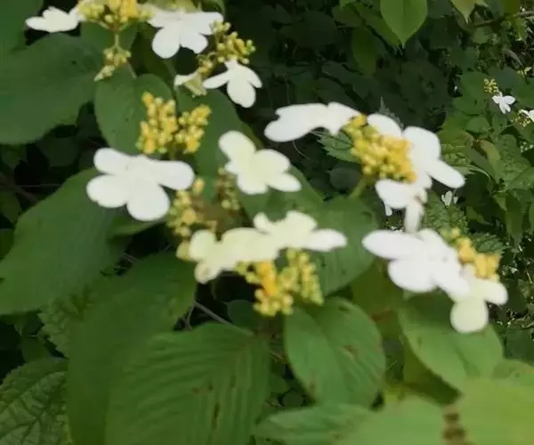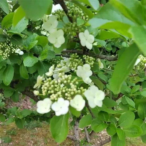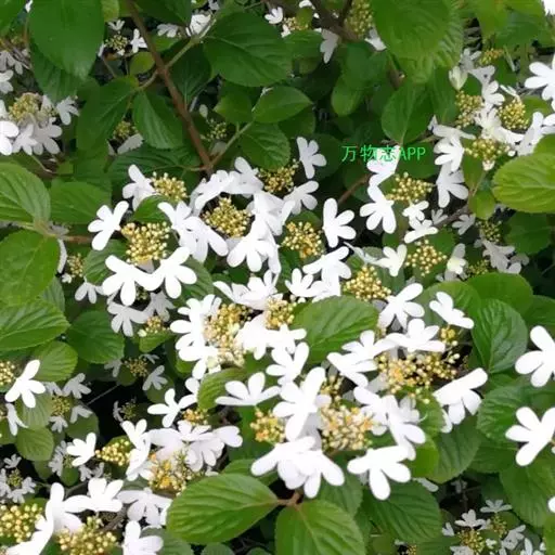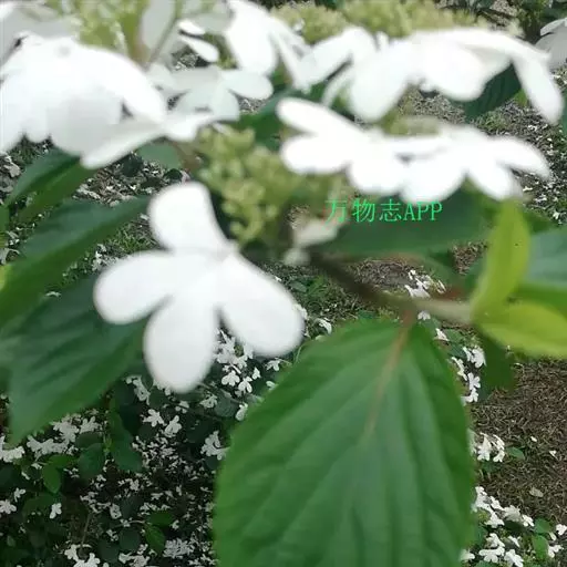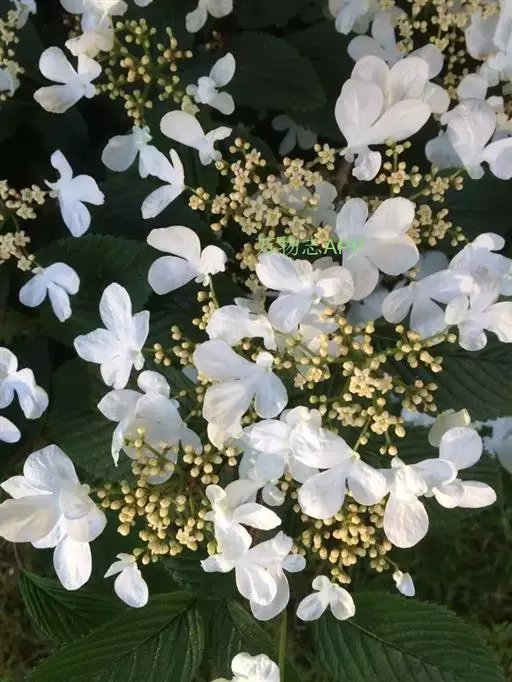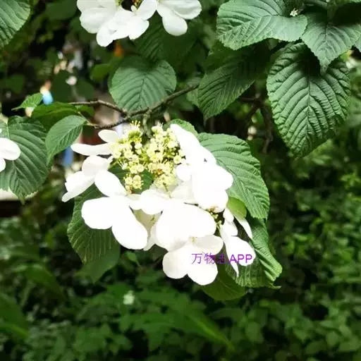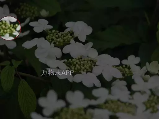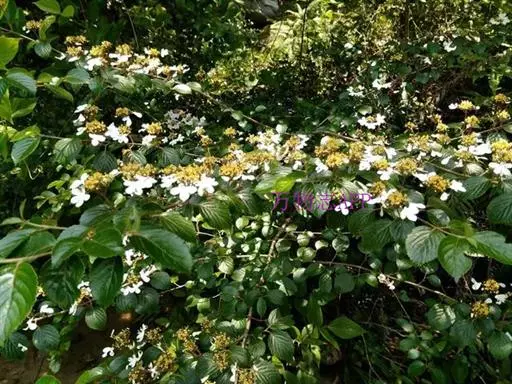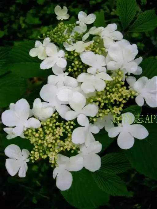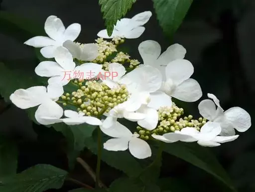 花序直径4-10厘米,外围有4-6朵白色、木型的不孕花,具长花梗,花冠直径达4厘米,不整齐4-5裂;中央可孕花直径约3毫米,萼筒长约15毫米,花冠辐状,黄白色,裂片宽卵形,长约等于筒,雄蕊高出花冠,花药近圆形。果实先红色后变黑色,宽卵圆形或倒卵圆形,长5-6毫米,直径约4毫米;核扁,两端钝形,有1条上宽下窄的腹沟,背面中下部还有1条短的隆起之脊。花期4-5月,果熟期8-9月。