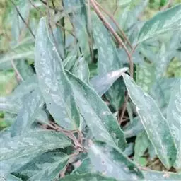 叶纸质,倒披针形、狭椭圆形,长4-11厘米,宽1.5-3.5厘米,先端渐尖,2/3以下渐狭成楔形;边缘具胼胝质齿尖的浅齿或仅具齿尖,近全缘,上面深绿色,下面灰绿带苍白色;侧脉每边5-7条;叶柄长1-2.5厘米,红色,具叶下延的狭膜翅。