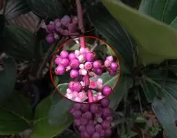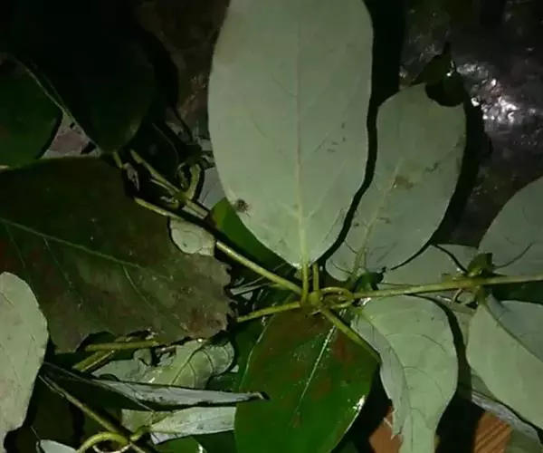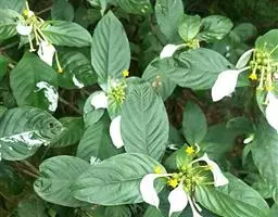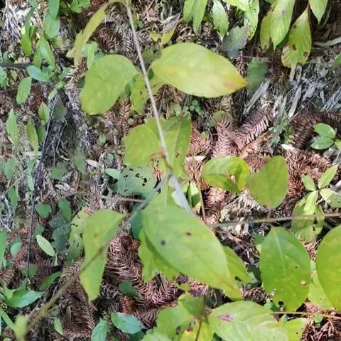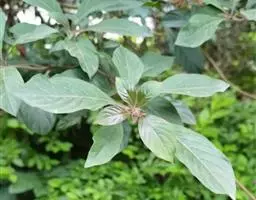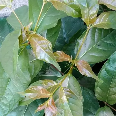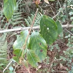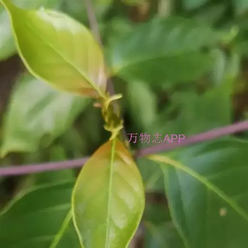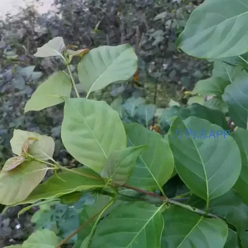 叶纸质,椭圆形或椭圆状长圆形,长5-12cm,宽3-7cm,两面均无毛,干时褐色或红褐色,下面有时有白粉,顶端短尖或骤尖,基部楔形至截形,有时稍下延;侧脉4-8对,脉腋窝陷有粘液毛;叶柄长5-15mm,无毛;托叶狭三角形,深2裂达全长2/3,外面无毛,里面无毛或基部具粘液毛,裂片线形至三角状披针形。