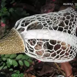 竹荪(Dictyophora indusiata (Vent.ex Pers) Fisch)又名竹笙、竹参,常见并可供食用的有4种:长裙竹荪、短裙竹荪、棘托竹荪和红托竹荪,是寄生在枯竹根部的一种隐花菌类,形状略似网状干白蛇皮,它有深绿色的菌帽,雪白色的圆柱状的菌柄,粉红色的蛋形菌托,在菌柄顶端有一围细致洁白的网状裙从菌盖向下铺开,被人们称为“雪裙仙子”、“山珍之花”、“真菌之花”、“菌中皇后”。