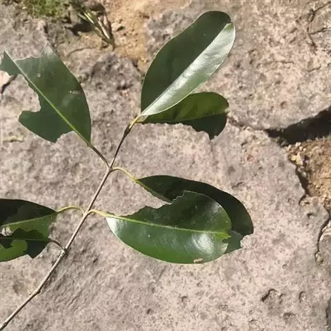灌木或中等乔木,高达20米;嫩枝圆形,干后变黑揭色。叶片革质,狭椭圆形至长圆形或为倒卵形,长3-7厘米,宽1.5-4厘米,先端钝或略尖,基部阔楔形或较狭窄,上面干后暗褐色,不发亮,有多数细小而下陷的腺点,下面同色,侧脉相隔约2毫米,以60度开角缓斜向上,在两面均不明显,边脉离边缘约0.5毫米;叶柄长3-6毫米。