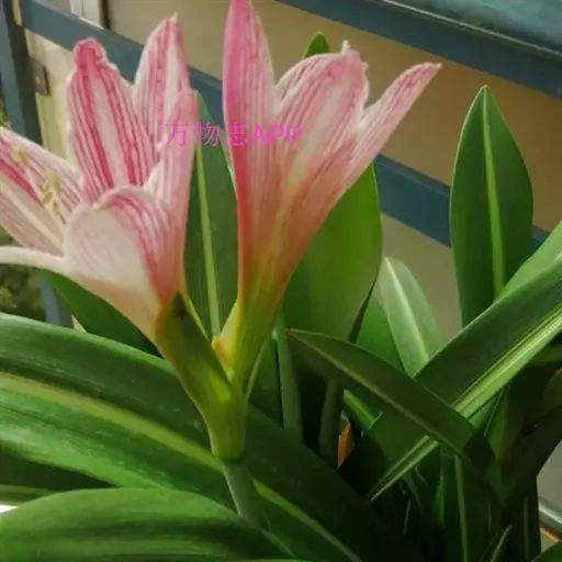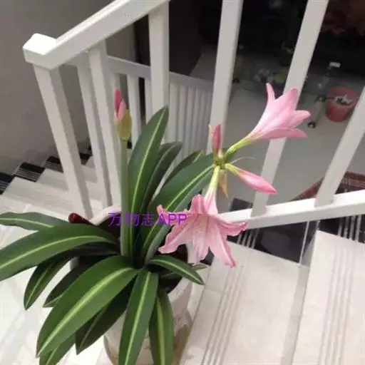 有肥大的鳞茎,近球形。叶片呈带状,与花茎同时或花后抽出。叶长约35厘米,宽约8厘米,翠绿色,叶片中央有一条宽1厘米左右的纵向白色锦斑,从叶基直至叶顶,花色大多为粉红色网纹状。