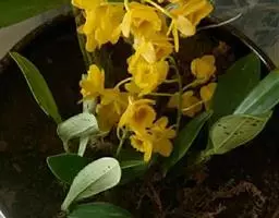 独角石斛,Dendrobium unicum,兰科石斛属植物。花瓣橙黄色,唇瓣反转似犀牛角,…