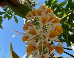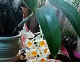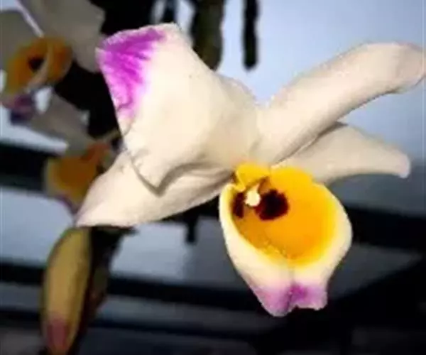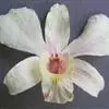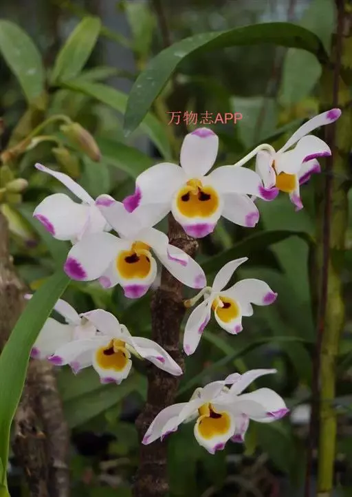 大苞鞘石斛(学名:Dendrobium wardianum Warner):茎斜立或下垂,肉质状肥厚,圆柱形不分枝,具多节;节间多少肿胀呈棒状。叶薄革质,二列,狭长圆形。总状花序从落了叶的老茎中部以上部分发出,具1-3朵花;花大,开展,白色带紫色先端;花瓣宽长圆形,与中萼片等长而较宽,达2.8厘米,先端钝,基部具短爪,具5条主脉和许多支脉;唇瓣白色带紫色先端,宽卵形。花期3-5月。
