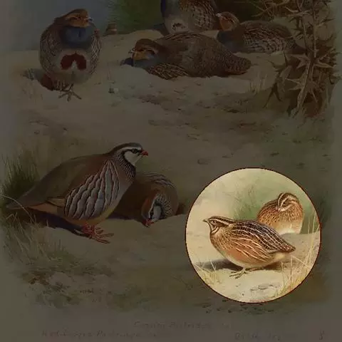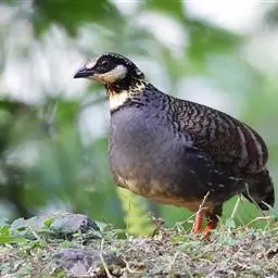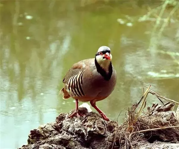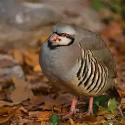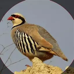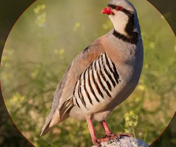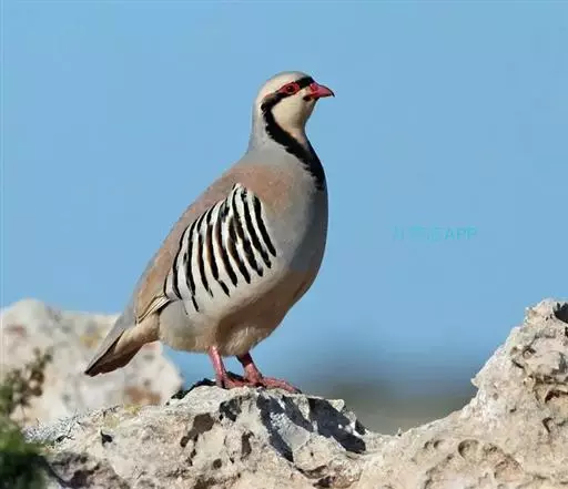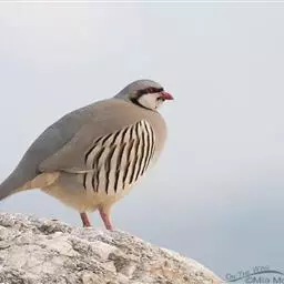 石鸡(学名:Alectoris chukar):是中型雉类,共有14个亚种,体长27-37厘米,体重440-580克,比山鹑稍大一些。两胁具显著的黑色和栗色斑。第1枚初级飞羽介于第5和第6枚飞羽之间,或于第6枚初级飞羽等长;第3枚初级飞羽常是最长的。尾圆;尾长约为翅长的2/3;尾羽14枚。雄者具微小的瘤状距,嘴和足红色。雌雄在羽色上一样,仅在大小上有些不同。嘴、脚珊瑚红色。虹膜栗褐色。眼的上方有一条宽宽的白纹。围绕头侧和黄棕色的喉部有完整的黑色环带。上体紫棕褐色,胸部灰色,腹部棕黄色,两胁各具十余条黑、栗色并列的横斑。