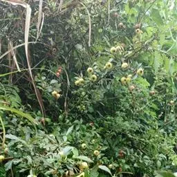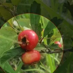 果实近球形或梨形,直径1-1.5厘米,深红色,有浅色斑点;小核3-5,外面稍具稜,内面两侧平滑;萼片脱落很迟,先端留一圆形深洼。花期5-6月,果期9-10月。