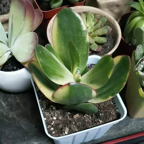 十字星锦肉质叶灰绿至浅绿色,叶片两边黄色或红色的锦,叶面有绿色斑点,叶缘温差大会稍具红色,在晚秋和早春,温差大的时候叶缘红色尤为明显,所以冬季是十字星锦最漂亮的时候。植株的叶片交互对生,卵状三角形,无叶柄,基部连在一起,新叶上下叠生,成叶上下有少许间隔。开花为米黄色,4~6月开放。