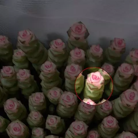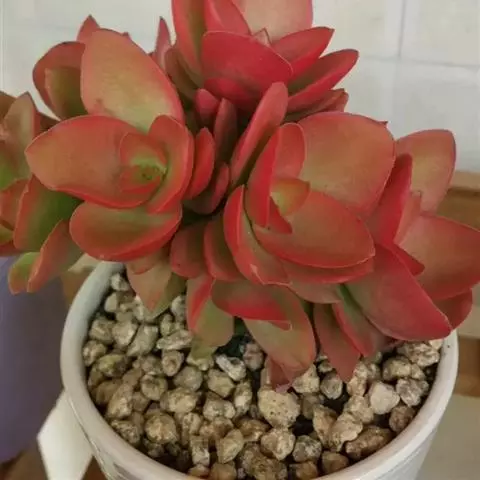 红稚儿Crassula pubescens subsp. radicans Toelken为景天科、青锁龙属多肉植物。植株丛生,有细小的分枝,茎肉质,时间养久了茎会逐渐半木质化,红稚儿叶片有点薄,叶片颜色绿。颜色反差巨大,平时为绿色,日照充足的春秋季节,变为火红色。野外分布于南非东开普省布什维德谷。喜温暖干燥和阳光充足的环境,怕低温和霜雪,耐半阴。叶形叶色较美,有一定的观赏价值;盆栽可放置于电视、电脑旁,可吸收辐射,亦可栽植于室内以吸收甲醛等物质,净化空气。